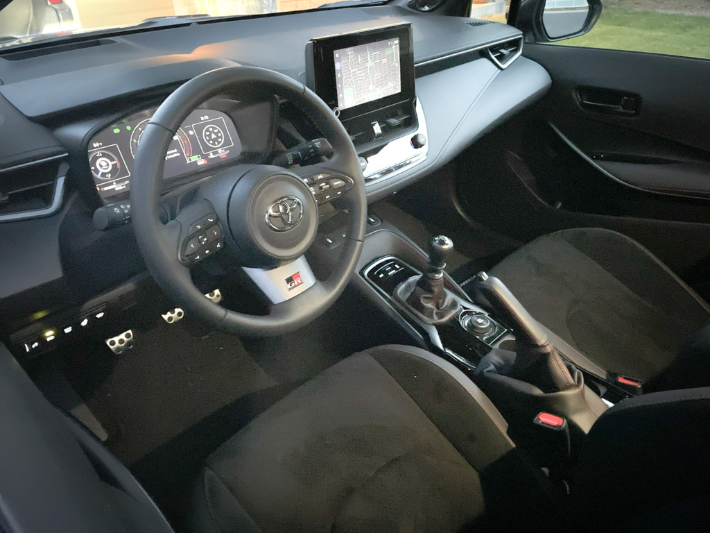 The Toyota hatchback-turned-race car will most remind you of its roots with its rather drab interior and unimpressive materials. It does, however, feature plenty of physical controls for most need-it-right-now tasks such as drive modes, engine rev-matching, and front-to-rear power distribution settings. The GR also adds deeply bolstered seats wrapped in a suede-like material, grippy stainless steel pedals, and a traditional handbrake.